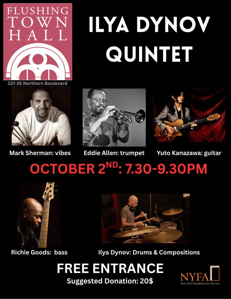 Ilya Dynov presents newly composed music, combined with jazz standards at Flushing Town Hall Queens.